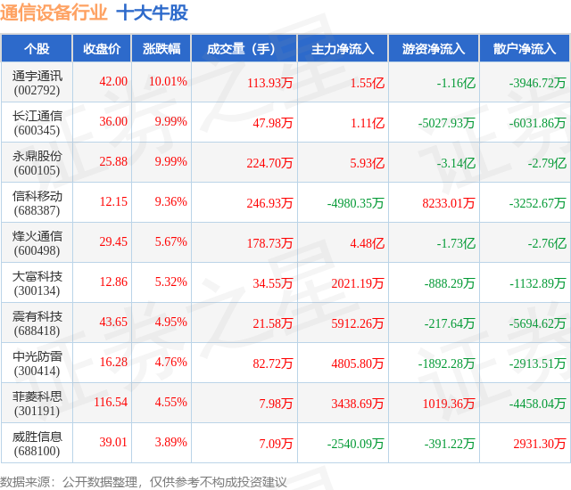 个股表现方面,通信设备行业当日领涨股为通宇通讯(002792),该股当日报收42.0,上涨10.01%,成交量113.93万,主力资金净流入1.55亿元。长江通信(600345)以上涨9.99%紧随其后,该股当日成交量47.98万,主力资金净流入1.11亿元。除此之外,永鼎股份(600105)、信科移动(688387)、烽火通信(600498)均进入当日牛股之列。具体个股列表见下表: