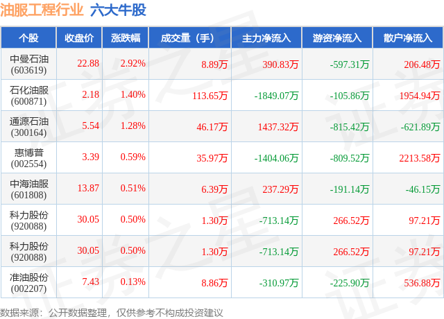 个股表现方面,油服工程行业当日领涨股为中曼石油(603619),该股当日报收22.88,上涨2.92%,成交量8.89万,主力资金净流入390.83万元。石化油服(600871)以上涨1.4%紧随其后,该股当日成交量113.65万,主力资金净流出1849.07万元。除此之外,通源石油(300164)、惠博普(002554)、中海油服(601808)均进入当日牛股之列。具体个股列表见下表:
