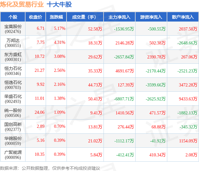 个股表现方面,炼化及贸易行业当日领涨股为宝莫股份(002476),该股当日报收6.71,上涨5.17%,成交量52.58万,主力资金净流出1536.95万元。万邦达(300055)以上涨4.31%紧随其后,该股当日成交量18.31万,主力资金净流入2146.28万元。除此之外,东方盛虹(000301)、恒力石化(600346)、恒逸石化(000703)均进入当日牛股之列。具体个股列表见下表: