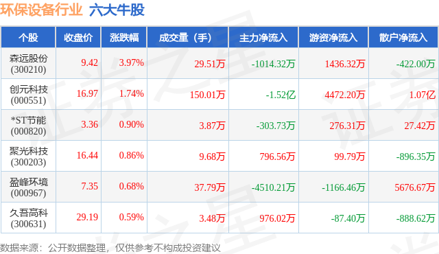 个股表现方面,环保设备行业当日领涨股为森远股份(300210),该股当日报收9.42,上涨3.97%,成交量29.51万,主力资金净流出1014.32万元。创元科技(000551)以上涨1.74%紧随其后,该股当日成交量150.01万,主力资金净流出1.52亿元。除此之外,*ST节能(000820)、聚光科技(300203)、盈峰环境(000967)均进入当日牛股之列。具体个股列表见下表: