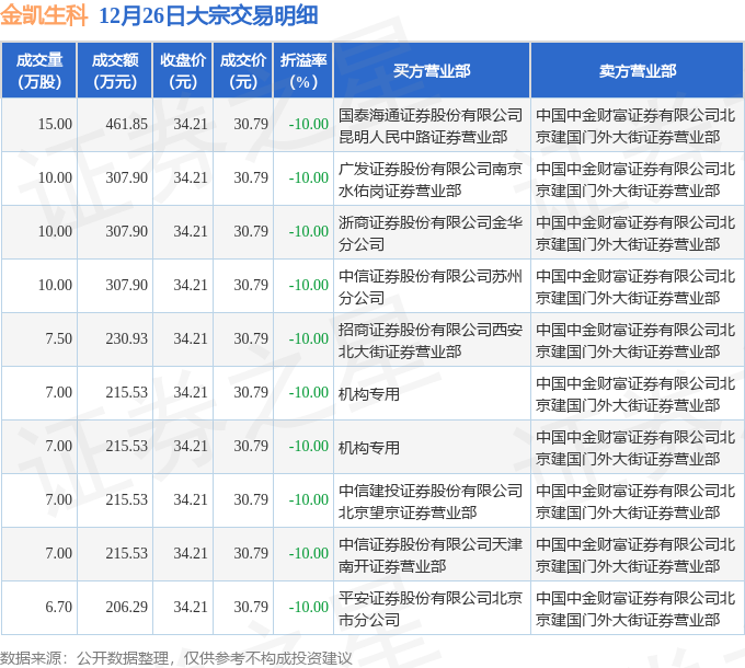 证券之星消息,12月26日金凯生科发生大宗交易,交易数据如下: