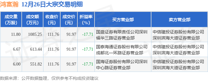 证券之星消息,12月26日鸿富瀚发生大宗交易,交易数据如下: