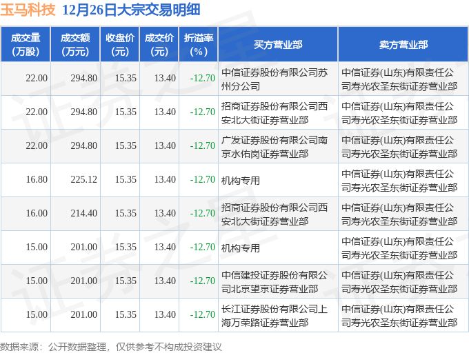 证券之星消息,12月26日玉马科技发生大宗交易,交易数据如下: