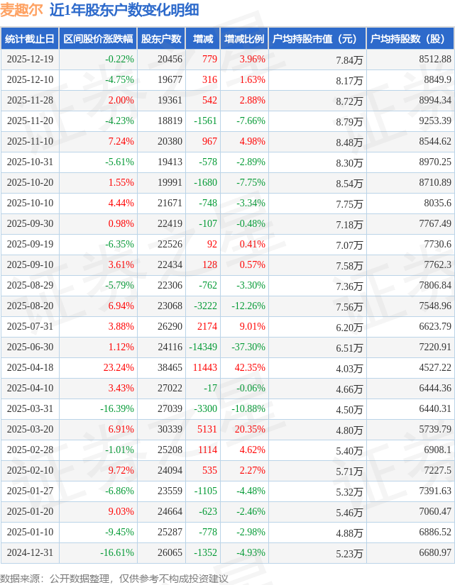 从股价来看,2025年12月10日至2025年12月19日,麦趣尔区间跌幅为0.22%,在此期间股东户数增加779.0户,增幅为3.96%。