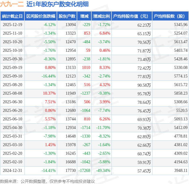 从股价来看,2025年11月10日至2025年12月19日,六九一二区间跌幅为6.12%,在此期间股东户数减少229.0户,减幅为1.72%。