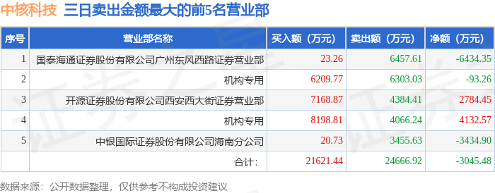 证券之星消息,沪深交易所2025年12月26日公布的交易公开信息显示,中核科技(000777)因连续三个交易日内,涨幅偏离值累计达到20%的证券登上龙虎榜。此次是近5个交易日内第1次上榜。