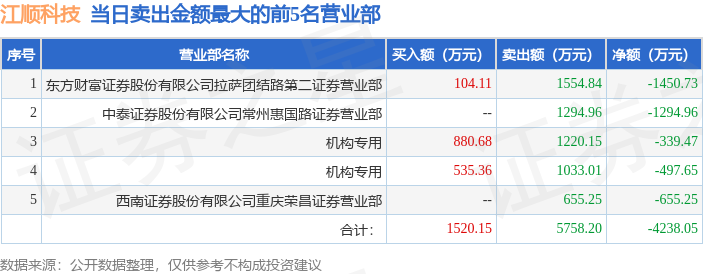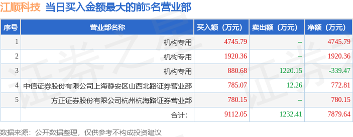 证券之星消息,沪深交易所2025年12月26日公布的交易公开信息显示,江顺科技(001400)因日换手率达到20%的前5只证券登上龙虎榜。此次是近5个交易日内第1次上榜。