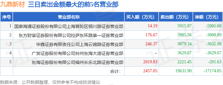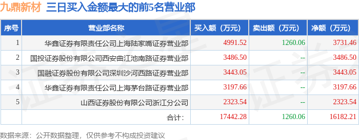 证券之星消息,沪深交易所2025年12月26日公布的交易公开信息显示,九鼎新材(002201)因连续三个交易日内,涨幅偏离值累计达到20%的证券登上龙虎榜。此次是近5个交易日内第2次上榜。