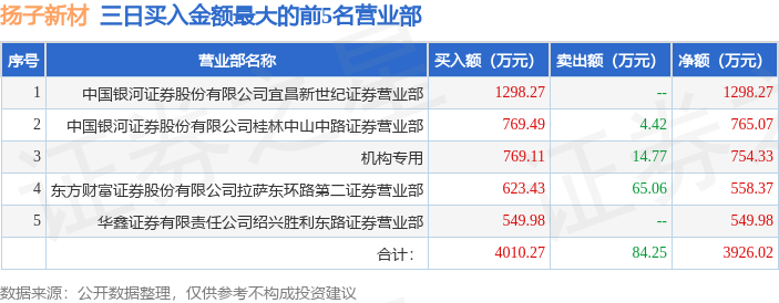 证券之星消息,沪深交易所2025年12月26日公布的交易公开信息显示,扬子新材(002652)因连续三个交易日内,涨幅偏离值累计达到20%的证券登上龙虎榜。此次是近5个交易日内第1次上榜。