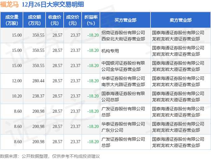 证券之星消息,12月26日福龙马发生大宗交易,交易数据如下: