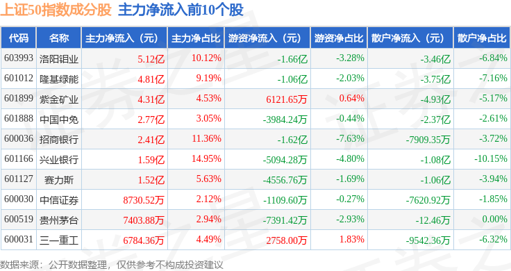 资金流向方面,上证50(000016)指数成份股当日主力资金净流出合计15.77亿元,游资资金净流入合计9.46亿元,散户资金净流入合计6.32亿元。成份股资金流向详情见下表: