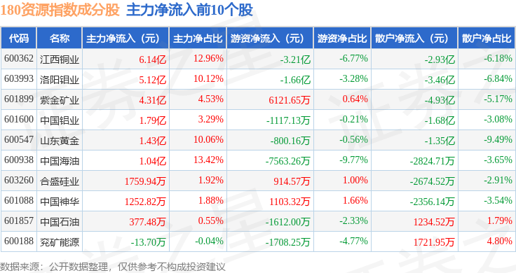 资金流向方面,180资源(000026)指数成份股当日主力资金净流入合计17.26亿元,游资资金净流出合计5.27亿元,散户资金净流出合计11.98亿元。成份股资金流向详情见下表: