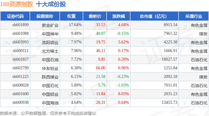 证券之星消息,12月26日,180资源(000026)指数报收于5450.47点,涨2.35%,成交399.93亿元,换手率0.45%。当日该指数成份股中,上涨的有12家,江西铜业以10.0%的涨幅领涨,下跌的有4家,中煤能源以1.18%的跌幅领跌。