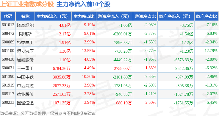 资金流向方面,上证工业(000034)指数成份股当日主力资金净流出合计7.03亿元,游资资金净流出合计3723.84万元,散户资金净流入合计7.4亿元。成份股资金流向详情见下表: