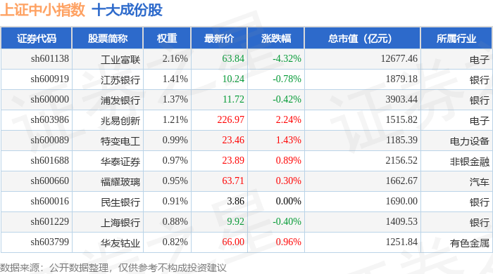 证券之星消息,12月26日,上证中小(000046)指数报收于5129.01点,涨0.35%,成交3713.23亿元,换手率1.18%。当日该指数成份股中,上涨的有226家,上海电力以10.02%的涨幅领涨,下跌的有202家,仕佳光子以5.46%的跌幅领跌。