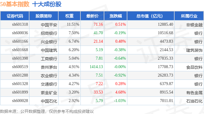 50基本(000052)指数十大成份股详情如下:
