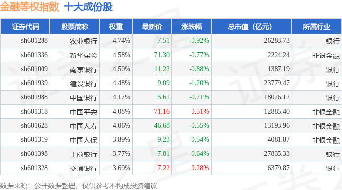 证券之星消息,12月26日,金融等权(000076)指数报收于5735.96点,跌0.33%,成交318.43亿元,换手率0.16%。当日该指数成份股中,上涨的有8家,华泰证券以0.89%的涨幅领涨,下跌的有21家,建设银行以1.2%的跌幅领跌。