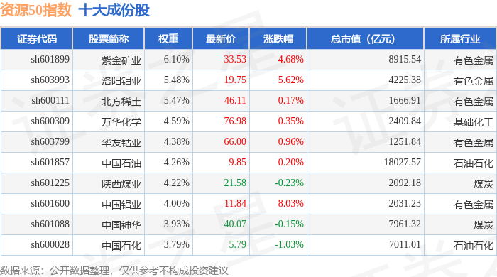 资源50(000092)指数十大成份股详情如下: