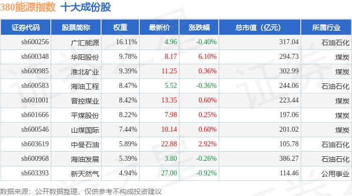 证券之星消息,12月26日,380能源(000104)指数报收于1268.47点,涨0.69%,成交32.4亿元,换手率0.8%。当日该指数成份股中,上涨的有9家,华阳股份以6.1%的涨幅领涨,下跌的有6家,新天然气以0.92%的跌幅领跌。