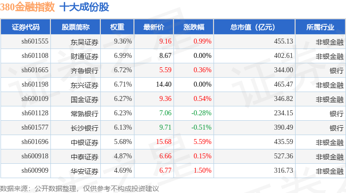 证券之星消息,12月26日,380金融(000110)指数报收于4299.22点,涨0.51%,成交101.06亿元,换手率1.25%。当日该指数成份股中,上涨的有12家,中银证券以5.59%的涨幅领涨,下跌的有7家,厦门银行以2.45%的跌幅领跌。