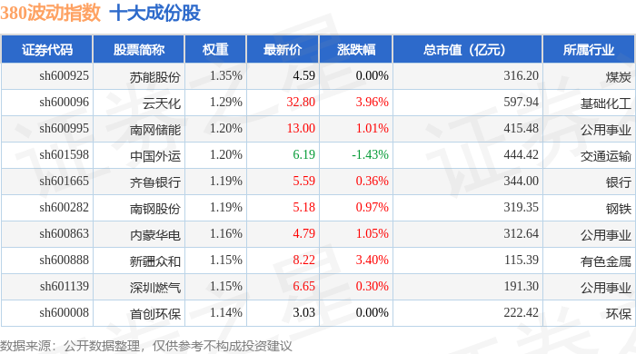 380波动(000130)指数十大成份股详情如下: