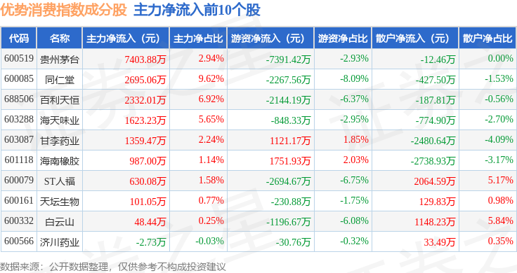 资金流向方面,优势消费(000147)指数成份股当日主力资金净流出合计5.75亿元,游资资金净流出合计1.03亿元,散户资金净流入合计6.78亿元。成份股资金流向详情见下表: