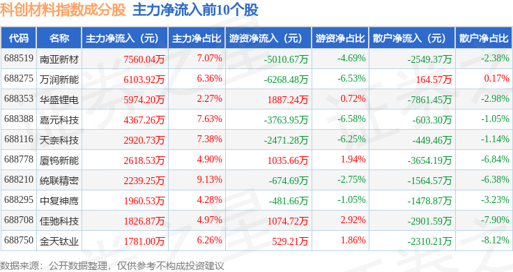 资金流向方面,科创材料(000689)指数成份股当日主力资金净流出合计7.04亿元,游资资金净流入合计1.19亿元,散户资金净流入合计5.85亿元。成份股资金流向详情见下表:
