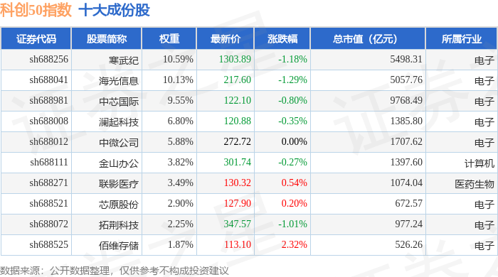证券之星消息,12月26日,科创50(000688)指数报收于1345.83点,跌0.24%,成交451.9亿元,换手率1.28%。当日该指数成份股中,上涨的有24家,盛科通信以5.65%的涨幅领涨,下跌的有25家,九号公司以3.72%的跌幅领跌。
