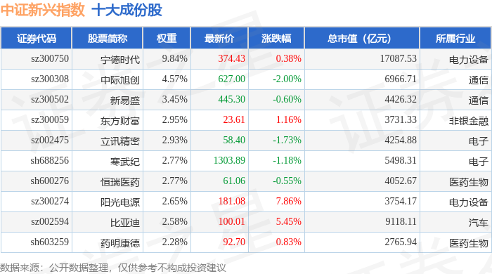 证券之星消息,12月26日,中证新兴(000964)指数报收于11174.68点,涨0.4%,成交2942.55亿元,换手率1.43%。当日该指数成份股中,上涨的有47家,中国卫通以9.98%的涨幅领涨,下跌的有51家,景旺电子以4.27%的跌幅领跌。