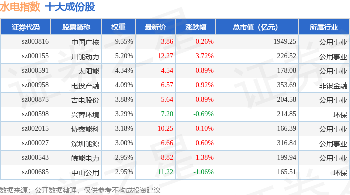 资金流向方面,水电指数(399234)成份股当日主力资金净流出合计2.6亿元,游资资金净流出合计3637.15万元,散户资金净流入合计2.96亿元。成份股资金流向详情见下表: