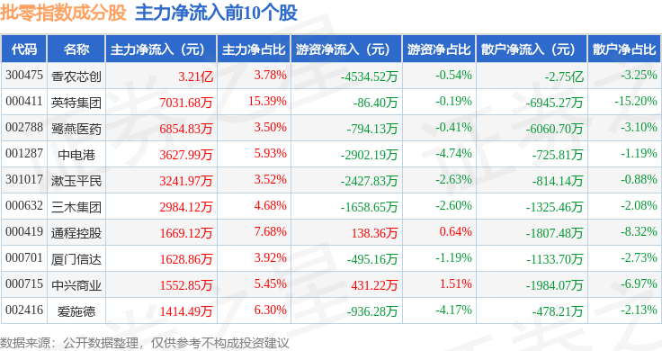 资金流向方面,批零指数(399236)成份股当日主力资金净流出合计7.49亿元,游资资金净流出合计2.36亿元,散户资金净流入合计9.85亿元。成份股资金流向详情见下表: