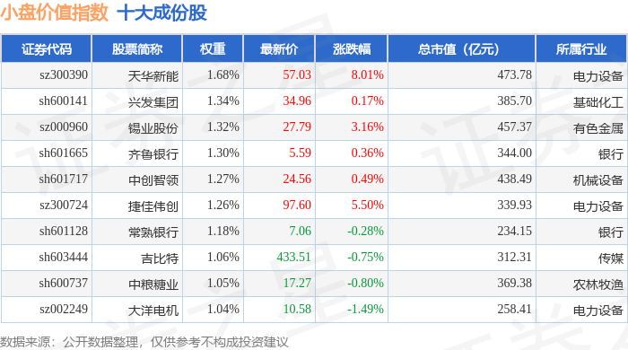证券之星消息,12月26日,小盘价值(399377)指数报收于7754.02点,涨0.8%,成交602.45亿元,换手率1.21%。当日该指数成份股中,上涨的有93家,永兴材料以10.01%的涨幅领涨,下跌的有56家,厦门银行以2.45%的跌幅领跌。