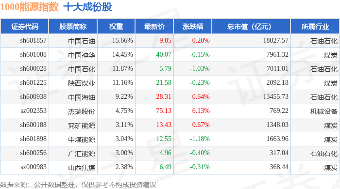 证券之星消息,12月26日,1000能源(399381)指数报收于3007.06点,涨0.45%,成交96.0亿元,换手率0.24%。当日该指数成份股中,上涨的有14家,杰瑞股份以6.13%的涨幅领涨,下跌的有9家,中煤能源以1.18%的跌幅领跌。