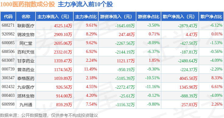 资金流向方面,1000医药(399386)指数成份股当日主力资金净流出合计14.18亿元,游资资金净流出合计6224.94万元,散户资金净流入合计15.12亿元。成份股资金流向详情见下表: