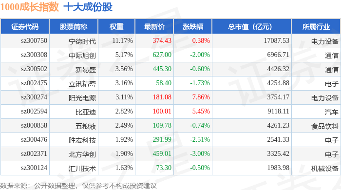 1000成长(399630)指数十大成份股详情如下: