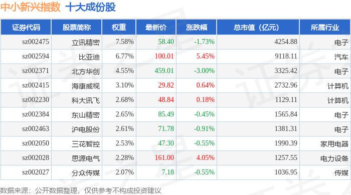 证券之星消息,12月26日,中小新兴(399642)指数报收于2360.19点,涨0.68%,成交1633.28亿元,换手率2.42%。当日该指数成份股中,上涨的有52家,协鑫集成以10.15%的涨幅领涨,下跌的有46家,麦格米特以4.87%的跌幅领跌。