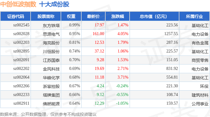 中创低波(399665)指数十大成份股详情如下: