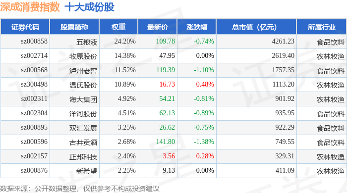 证券之星消息,12月26日,深成消费(399684)指数报收于1810.98点,跌0.49%,成交100.14亿元,换手率1.1%。当日该指数成份股中,上涨的有9家,万辰集团以1.64%的涨幅领涨,下跌的有16家,新诺威以6.77%的跌幅领跌。