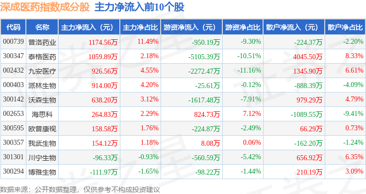 资金流向方面,深成医药(399685)指数成份股当日主力资金净流出合计9.45亿元,游资资金净流出合计301.3万元,散户资金净流入合计9.48亿元。成份股资金流向详情见下表: