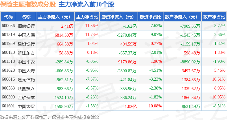 资金流向方面,保险主题(399809)指数成份股当日主力资金净流出合计4.63亿元,游资资金净流入合计3732.28万元,散户资金净流入合计4.26亿元。成份股资金流向详情见下表: