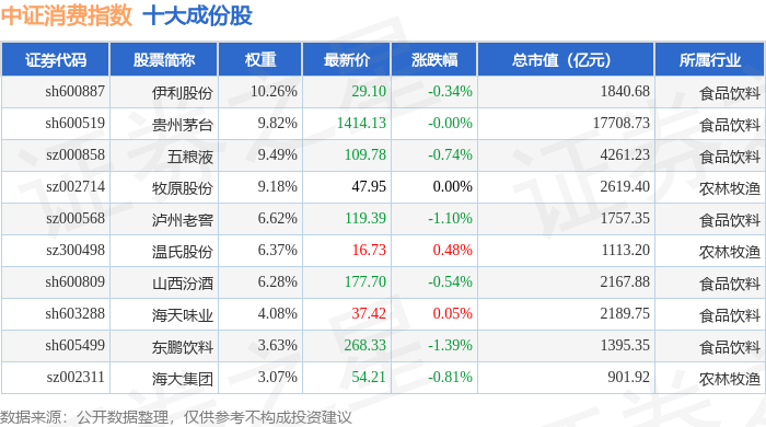 证券之星消息,12月26日,中证消费(399932)指数报收于15415.97点,跌0.37%,成交156.86亿元,换手率0.99%。当日该指数成份股中,上涨的有11家,海南橡胶以5.03%的涨幅领涨,下跌的有25家,养元饮品以2.28%的跌幅领跌。