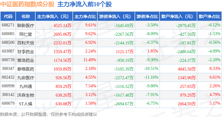 资金流向方面,中证医药(399933)指数成份股当日主力资金净流出合计12.96亿元,游资资金净流出合计1.18亿元,散户资金净流入合计14.13亿元。成份股资金流向详情见下表: