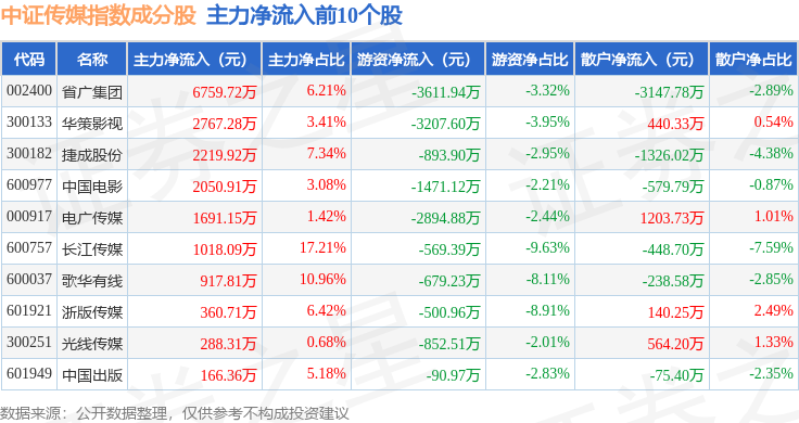 资金流向方面,中证传媒(399971)指数成份股当日主力资金净流出合计13.36亿元,游资资金净流入合计6485.07万元,散户资金净流入合计12.71亿元。成份股资金流向详情见下表:
