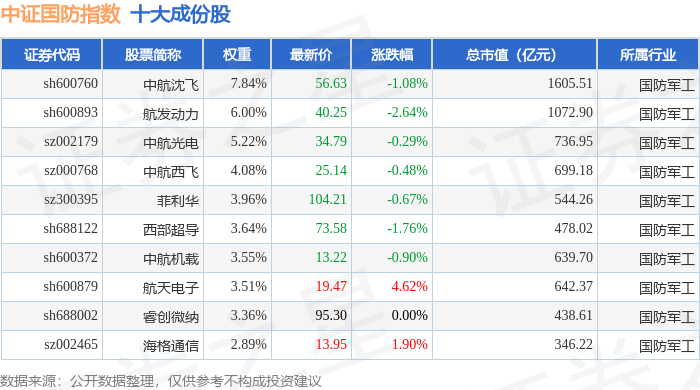 资金流向方面,中证国防(399973)指数成份股当日主力资金净流出合计45.16亿元,游资资金净流入合计6.78亿元,散户资金净流入合计38.37亿元。成份股资金流向详情见下表: