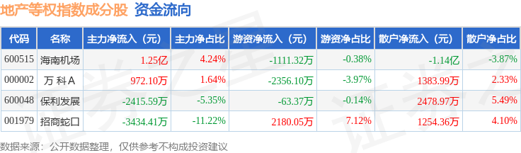 资金流向方面,地产等权(399983)指数成份股当日主力资金净流入合计7609.42万元,游资资金净流出合计1350.74万元,散户资金净流出合计6258.68万元。成份股资金流向详情见下表: