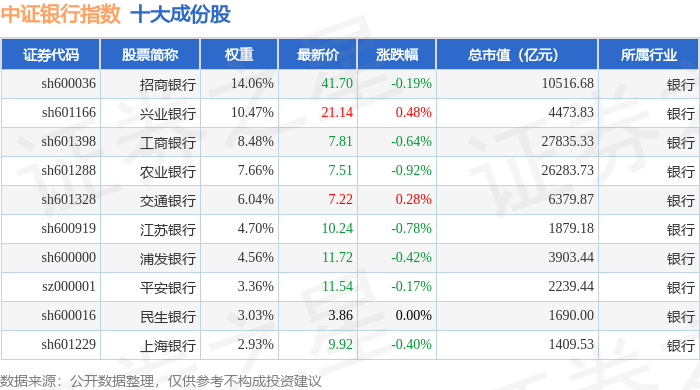 证券之星消息,12月26日,中证银行(399986)指数报收于7528.82点,跌0.35%,成交172.47亿元,换手率0.16%。当日该指数成份股中,上涨的有6家,瑞丰银行以1.25%的涨幅领涨,下跌的有33家,厦门银行以2.45%的跌幅领跌。