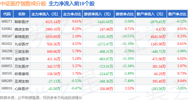 资金流向方面,中证医疗(399989)指数成份股当日主力资金净流出合计8.75亿元,游资资金净流出合计3372.07万元,散户资金净流入合计9.4亿元。成份股资金流向详情见下表: