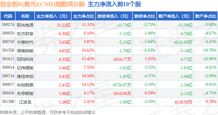 资金流向方面,创业板R(美元)(CNH)(470007)指数成份股当日主力资金净流出合计40.31亿元,游资资金净流入合计13.5亿元,散户资金净流入合计26.81亿元。成份股资金流向详情见下表: