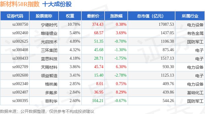 证券之星消息,12月26日,新材料50R(470042)指数报收于4319.13点,涨1.34%,成交943.82亿元,换手率3.47%。当日该指数成份股中,上涨的有31家,永兴材料以10.01%的涨幅领涨,下跌的有19家,惠城环保以3.39%的跌幅领跌。