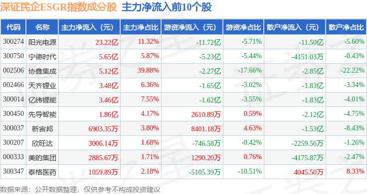 资金流向方面,深证民企ESGR(470056)指数成份股当日主力资金净流入合计3.66亿元,游资资金净流出合计15.34亿元,散户资金净流入合计11.69亿元。成份股资金流向详情见下表: